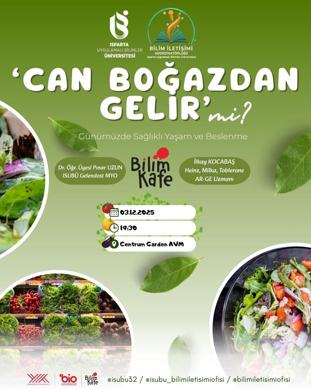 Üniversitemiz Bilim İletişimi Koordinatörlüğü tarafından organize edilen "CAN BOĞAZDAN GELİR" Mİ? adlı ve Günümüzde Sağlıklı Yaşam ve Beslenme temalı Bilim Kafe söyleşimiz ilgi duyan herkesi 03.12.2025 tarihi saat 19:30'da Centrum Garden AVM'ye bekleriz.